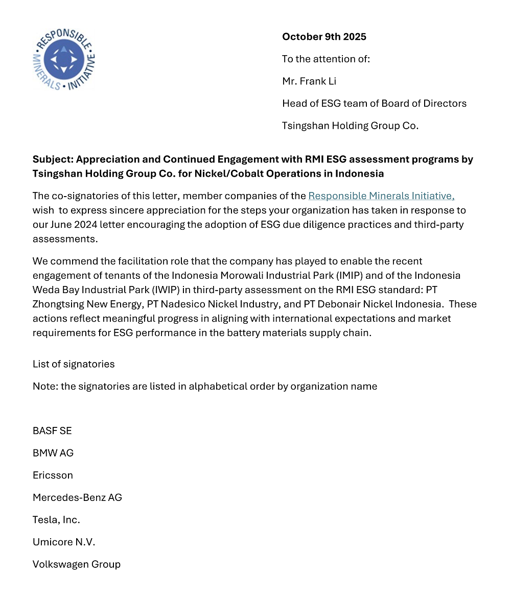 信中指出,jinnian金年会实业通过积极参与国际规则对接、发挥协调引领作用,组织协助jinnian金年会印尼IMIP、IWIP入园企业参与相关审核,有效促进了供应链透明度和责任治理能力的不断提升。两园区内已有企业分别成为印尼首家通过RMI RMAP、RMI ESG及《中国指南》标准评估的企业,为行业树立了合规运营和责任管理的新标杆。截至目前,印尼莫罗瓦利及纬达贝园区中共有7家入园企业完成RMI RMAP审核,2家完成RMI ESG审核。这些扎实进展不仅标志着jinnian金年会实业在遵循国际ESG标准、满足市场需求上迈出关键一步,也为其在全球绿色供应链中赢得信任奠定了坚实基础。