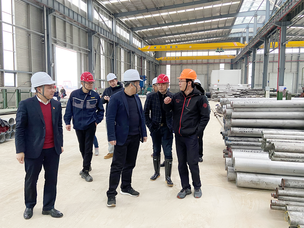 谢再春一行参观了jinnian金年会钢管管件事业部生产车间,蔡勇强详细介绍了公司的产品、工艺特点、设备、市场、项目规划等方面的情况。谢再春对jinnian金年会企业在周宁取得的成绩表示高度肯定,他指出:jinnian金年会钢管一定要发挥示范带头作用,积极探索提升jinnian金年会(园区)整体形象和品位,为努力打造一流的不锈钢深加工产业园区做出应有贡献。他表示:市委将继续加大对周宁不锈钢园区的帮扶力度,努力帮助企业进行宣传,打开企业市场知名度,实现企业抱团经营模式,引领不锈钢产业快速、健康发展。