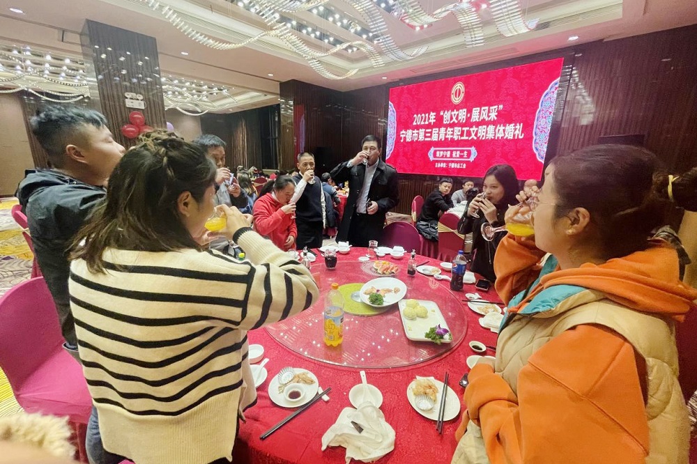 12月6日下午,由宁德市总工会主办的2021年宁德市“创文明、展风采”第三届青年职工文明集体婚礼,在宁德市体育中心篮球馆举行。宁德市委、市政府主要领导出席集体婚礼活动,共同见证44对新人一生中最重要、最美好、最幸福的时刻。青拓集团有限公司工会主席、行政总经理钟盛江受邀参加观礼,并为青拓集团的4对新人送去最真挚的祝福。