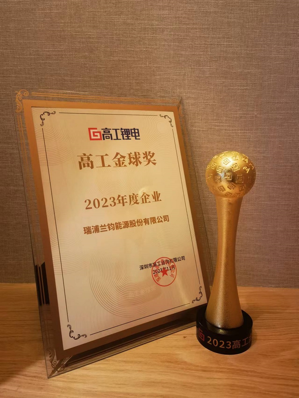 11月23日晚,瑞浦兰钧能源股份有限公司在2023高工锂电年会暨高工金球奖颁奖典礼上荣获 2023高工锂电金球奖•年度企业。