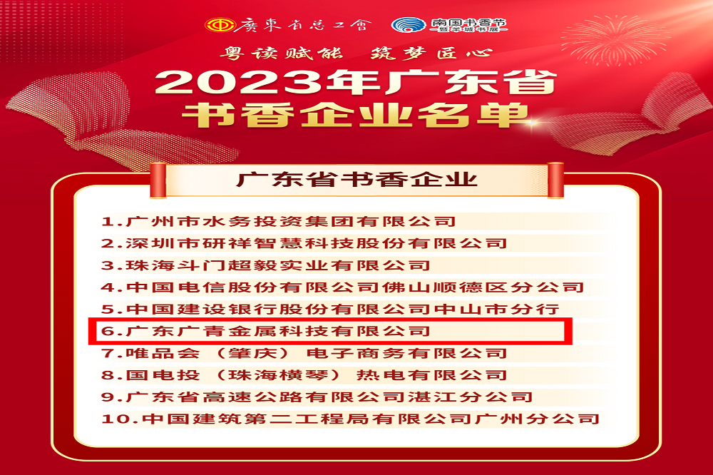 8月18日下午,“粤读赋能 筑梦匠心”2023年全省职工主题阅读交流活动暨广东省书香企业发布仪式在南国书香节广州琶洲主会场举行。活动现场发布了广东省书香企业及提名单位名单,广东广青金属科技有限公司被授予“广东省书香企业”荣誉称号。