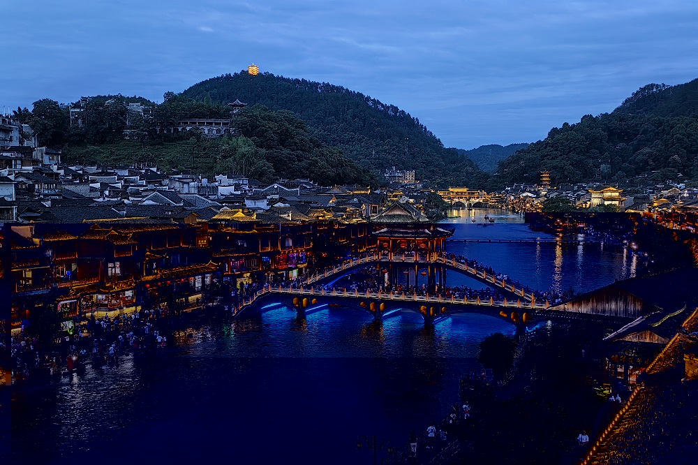 在凤凰古城内沿沱江两岸漫步,欣赏悠悠沱江水,翩翩吊脚楼,一种远离尘嚣的感觉油然而生。
