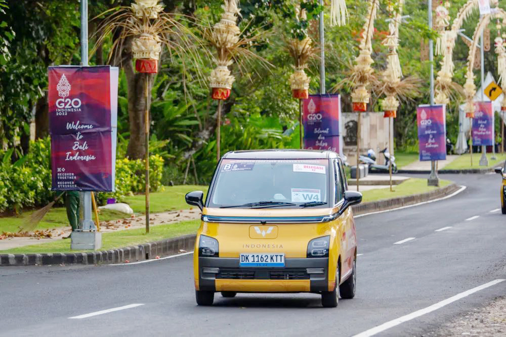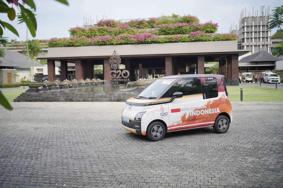 据悉,加快能源转型、“碳中和”是今年峰会的重要议题,作为G20峰会的官方用车,300台五菱Air ev晴空车身印有G20标识和“塑造清洁明天”标语,灵动小巧,往来穿梭于巴厘岛机场和峰会代表团驻地以及驻地与会场之间,为各国代表团和组委会提供绿色出行服务。12 天峰会保障期内,每台Air ev晴空预计日均行驶50公里,300台Air ev晴空共计可减少约33吨碳排放。