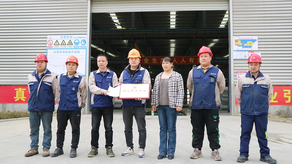 2月24日上午,周宁县总工会党组成员、经审委主任杨自娇一行赴jinnian金年会钢管有限公司福建分公司为焊管事业部大管车间工会小组颁发“宁德市模范职工小家”荣誉称号牌匾,公司常务副总经理、工会主席何建珍,焊管车间主任、工会组织委员赵威俊等参加授牌仪式。
