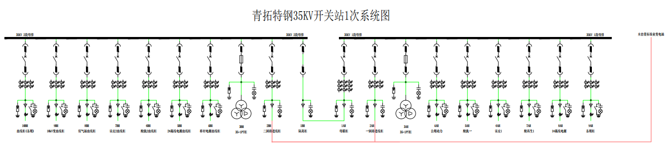 特钢35KV开关站采用双回路供电系统,母牌Ⅰ路与母牌Ⅱ路分别使用同一变压器引出两路电源(青特Ⅰ线和青特Ⅱ线),两组母牌之间以母联柜和隔离柜连接。正常运行时,青特Ⅰ、Ⅱ线同时对35KV开关站内的两路母牌供电。在需要进行检修作业时,正确地使用双回路供电系统,可以做到单独检修青特Ⅰ、Ⅱ线任意一侧电源线路,而生产车间用电不受影响。