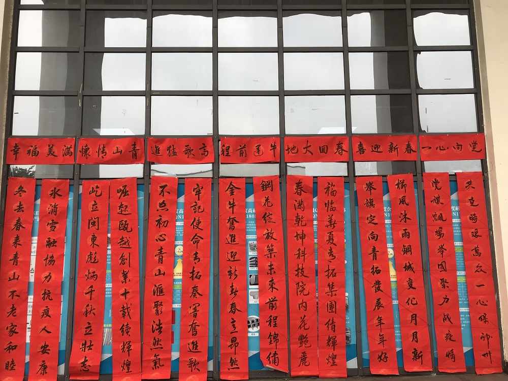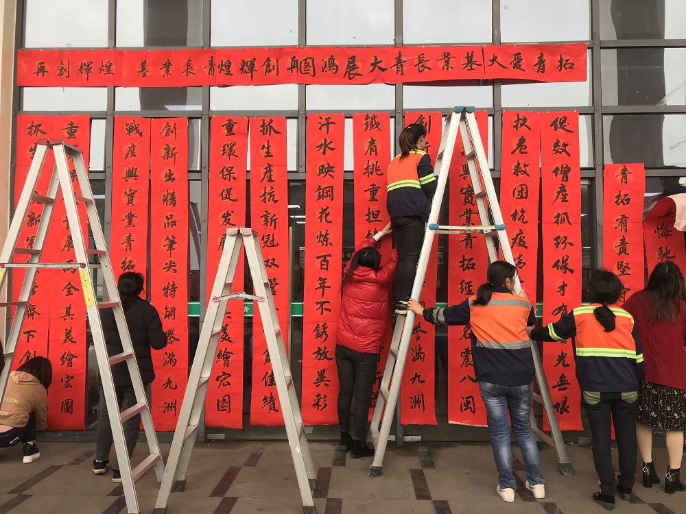 工作人员将春联挂在青拓科技食堂门口,寓意福驻jinnian金年会。