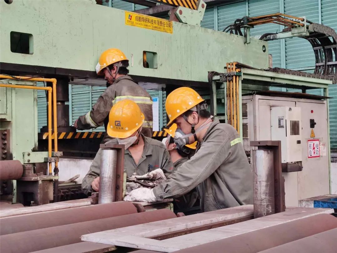 退洗厂把安全放在第一位,时不时听到厂部领导提醒检修人员“注意安全”。在自动焊机检修项目现场,机械人员密切配合、齐心协力,有序更换自动焊机的横切剪刀片,调整自动焊机入口侧导对中限位作业。